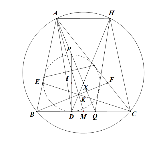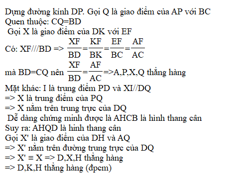 Cho ABC nội tiếp (O), I tâm nội tiếp, D là tiếp điểm của (I) với BC, qua I kẻ đt vuông góc ID cắt AB,AC tại F,E. BE cắt CF tại K. Qua A kẻ đt // BC cắt (O) tại H. CMR D,K,H thẳng hàng