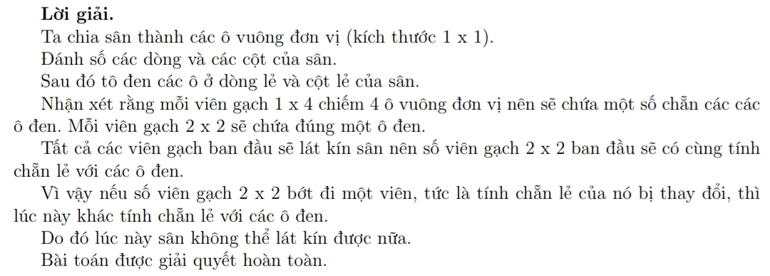 Bài toán 33. Một cái sân hình chữ nhật được lát bởi các miếng gạch \(2\times 2\) và \(1\times 4\). Sau đó người ta bị mất 1 viên \(2\times 2\) và bổ sung 1 viên \(1\times 4\).