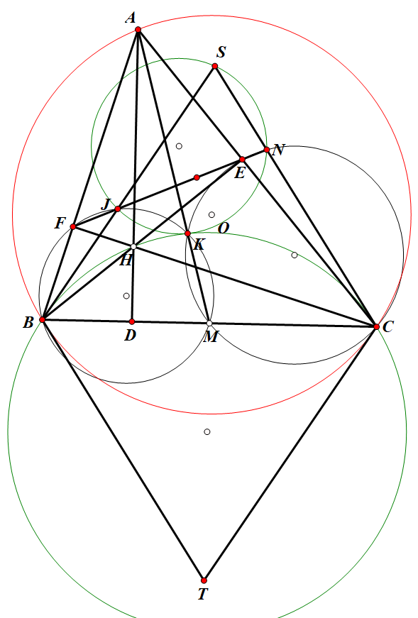 Lời giải. Ta có: (O) và (BHC) đối xứng nhau qua BC nên SB,SC là tiếp tuyến đến (BHC). Gọi K là hình chiếu của H lên AM. Ta có: AH.AD=AK.AM=AF.AB nên: F,K,M,B đồng viên. Tương tự: K,E,C,M đồng viên. Ta có: ∠SCM=∠TCB=∠A=∠MEF suy ra: N thuộc (MEC). Tương tự thì: J thuộc (BFM).